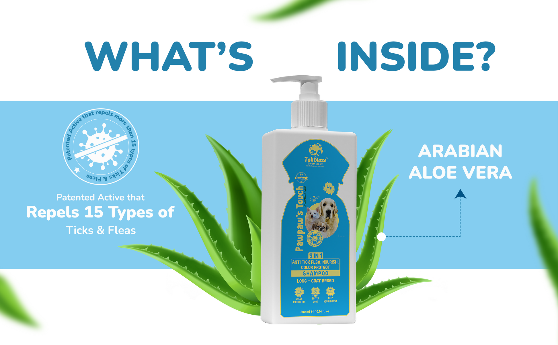 - The 3 in 1 Dog Shampoo for dogs helps in preserving the furry natural coat and protects the colour. Patented Active that repels 15 types of Ticks & Fleas. pH - 7 , Ideal for all pets.